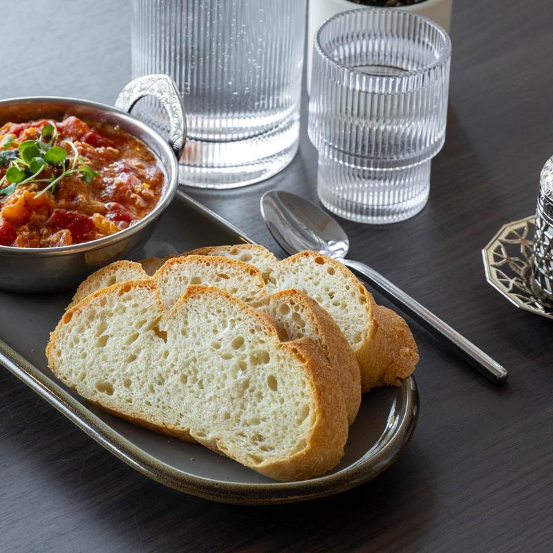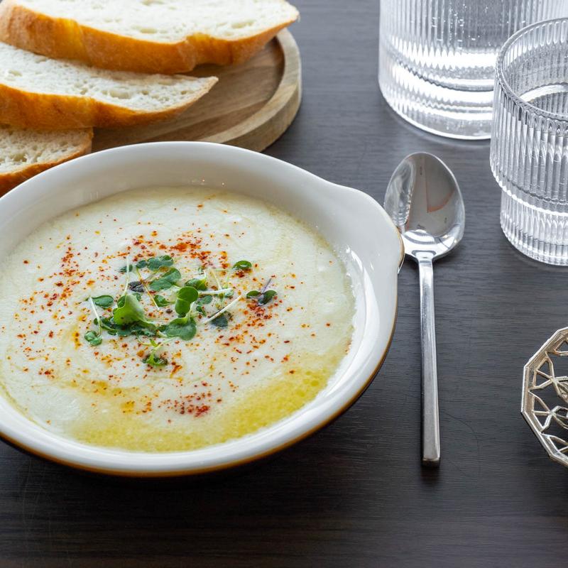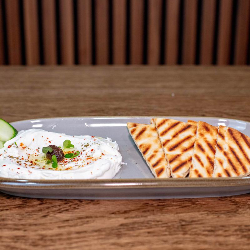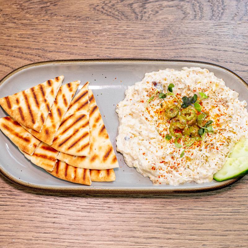 Smoky eggplant dip, tahini, garlic, and lemon. A Mediterranean delight.