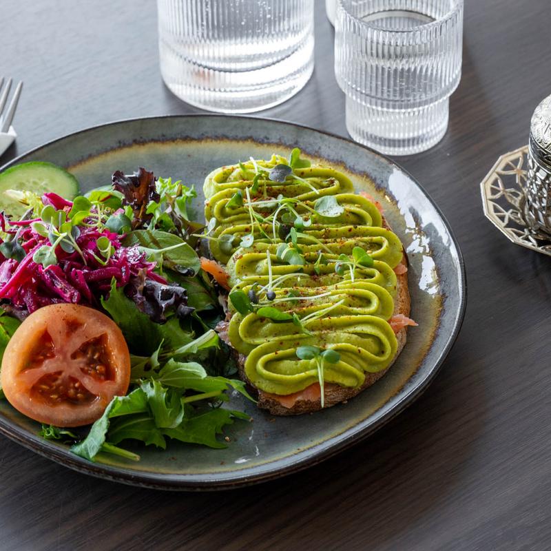 Smoked salmon on a toasted bun with avocado spread, topped with microgreens, served with a side salad of mixed greens, pickled red cabbage, cucumber slices, and a tomato wedge.