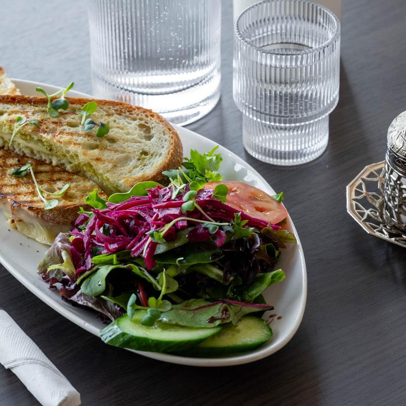 Grilled sandwich with fresh pesto, arugula, and melted cheese, accompanied by a side salad of mixed greens, tomato slices, cucumber, and pickled red cabbage.