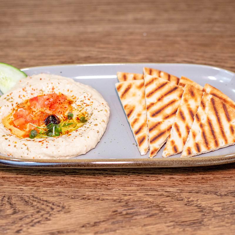 Smooth chickpea puree garnished with olive oil, paprika, parsley, and black olive, served with pita bread wedges.