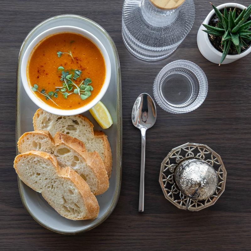 Rich lentil soup garnished with a swirl of olive oil served with slices of fresh bread.