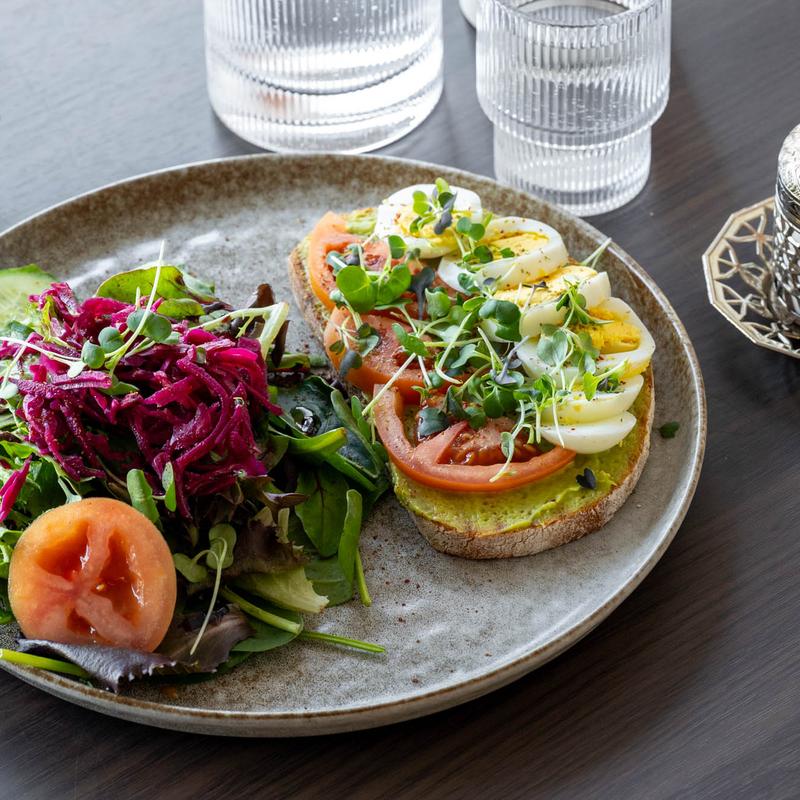 Sliced tomatoes, boiled eggs, and microgreens on avocado spread toast served with a mixed greens salad, pickled red cabbage, and cucumber slices.