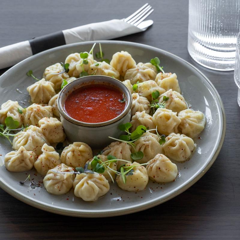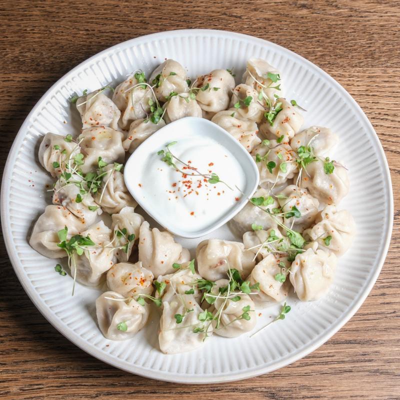 Tender beef-filled dumplings, garnished with a sprinkle of spices, served with a side of rich tomato-based sauce.