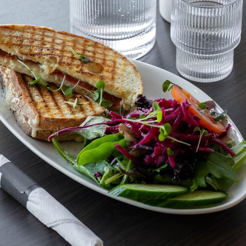 Grilled sandwich with melted cheese, fresh greens, and a side salad featuring cucumber, tomato, and mixed greens.